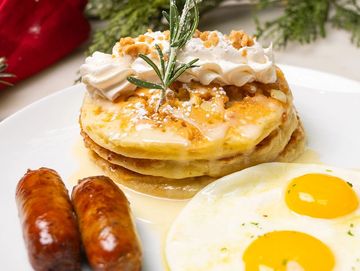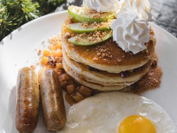 Three fluffy pancakes filled with caramelized cinnamon apples, topped with fresh apple slices, caramel sauce, signature whip cream and house-made crumble topping. Served with two cage free eggs any style, and your choice of bacon, sausage, turkey bacon, or chorizo.