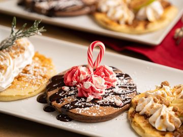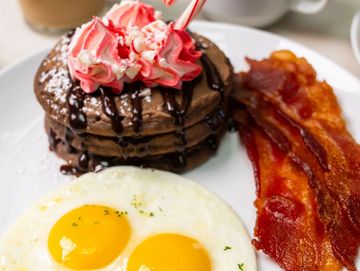 Three fluffy chocolate pancakes filled with chocolate chips, drizzled with chocolate sauce, topped with crushed peppermint and seasonal house-made candy cane whip cream. Served with two cage free eggs any style, and your choice of bacon, sausage, turkey bacon, or chorizo.